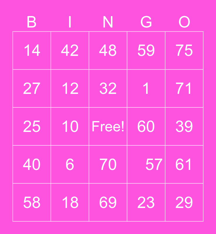 This bingo card has a free space and 24 words: 6, 18, 32, 58, 75, 14, 27, 42, 60, 70, 1, 25, 57, 61, 12, 23, 39, 48, 71, 10, 29, 40, 59 and 69.