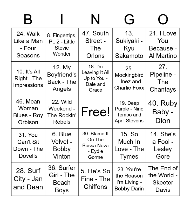 This bingo card has a free space and 49 words: Surfin' U.S.A. - The Beach Boys, The End of the World - Skeeter Davis, 4. Rhythm of the Rain - The Cascades, 5. He's So Fine - The Chiffons, 6. Blue Velvet - Bobby Vinton, 7. Hey Paula - Paul and Paula, 8. Fingertips, Pt. 2 - Little Stevie Wonder, 9. Washington Square - Village Stompers, 10. It's All Right - The Impressions, 11. Can't Get Used to Losing You - Andy Williams, 12. My Boyfriend's Back - The Angels, 13. Sukiyaki - Kyu Sakamoto, 14. She's a Fool - Lesley Gore, 15. So Much In Love - The Tymes, 16. Puff, the Magic Dragon - Peter, Paul and Mary, 17. Blowin' In the Wind - Peter, Paul and Mary, 18. I'm Leaving It All Up to You - Dale and Grace, 19. Deep Purple - Nino Tempo and April Stevens, 20. Wipe Out - The Surfaris, 21. I Love You Because - Al Martino, 22. Wild Weekend - The Rockin' Rebels, 23. You're the Reason I'm Living - Bobby Darin, 24. Walk Like a Man - Four Seasons, 25. Mockingbird - Inez and Charlie Foxx, 26. I Will Follow Him - Little Peggy March, 27. Pipeline - The Chantays, 28. Surf City - Jan and Dean, 29. It's My Party - Lesley Gore, 30. Blame It On The Bossa Nova - Eydie Gorme, 31. You Can't Sit Down - The Dovells, 32. Heat Wave - Martha and The Vandellas, 33. Denise - Randy and The Rainbows, 34. Walk Right In - The Rooftop Singers, 35. If You Wanna Be Happy - Jimmy Soul, 36. Surfer Girl - The Beach Boys, 37. If I Had a Hammer - Trini Lopez, 38. Everybody - Tommy Roe, 39. Easier Said Than Done - Essex, 40. Ruby Baby - Dion, 41. Maria Elena - Los Indios Tabajaras, 42. Our Day Will Come - Ruby and The Romantics, 43. I Can't Stay Mad At You - Skeeter Davis, 44. Hello Stranger - Barbara Lewis, 45. Be My Baby - The Ronettes, 46. Mean Woman Blues - Roy Orbison, 47. South Street - The Orlons, 48. Days of Wine and Roses - Henry Mancini, 49. The Monkey Time - Major Lance and 50. Candy Girl - The Four Seasons.