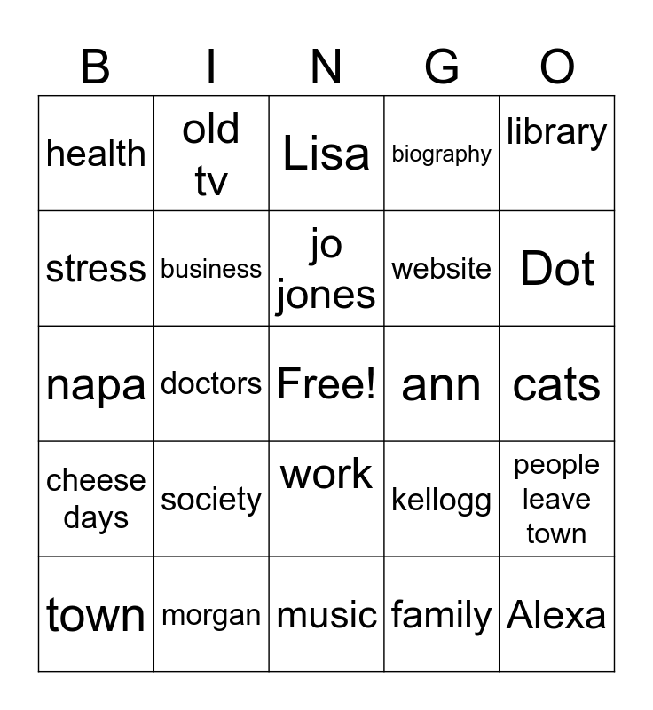 This bingo card has a free space and 24 words: society, morgan, jo jones, town, library, health, stress, old tv, ann, work, website, napa, kellogg, people leave town, business, family, cats, Lisa, Dot, doctors, Alexa, cheese days, biography and music.