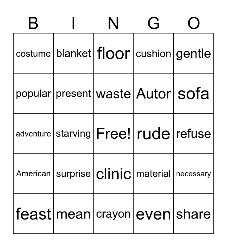 This bingo card has a free space and 29 words: feast, roasted duck, starving, dump, costume, floor, present, surprise, rude, mean, refuse, share, crayon, even, sofa, spoiled, clinic, American, gentle, adventure, material, glad, Autor, popular, cushion, blanket, necessary, waste and replace.