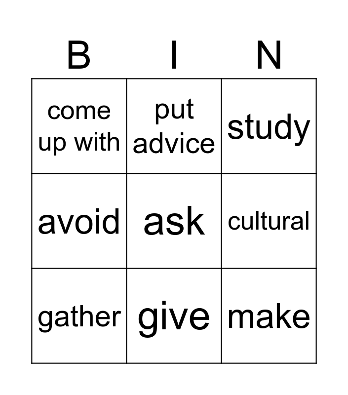 This bingo card has a free space and 11 words: run, give, make, gather, put advice, study, cultural, prioritise, avoid, come up with and study.