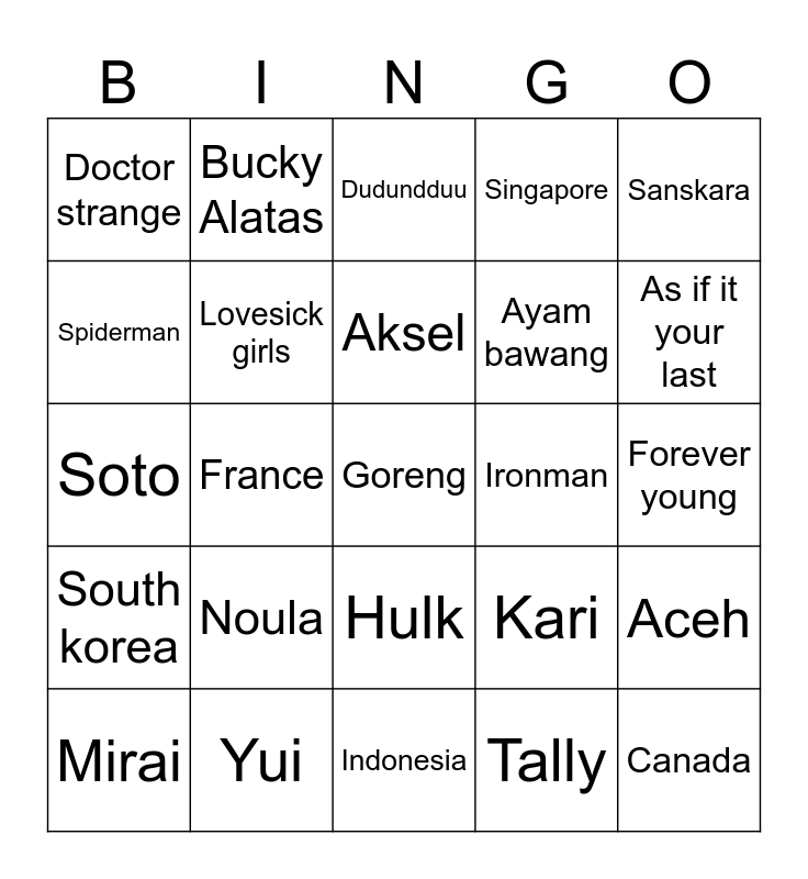 This bingo card has a free space and 24 words: Noula, Yui, Aksel, Mirai, Sanskara, Doctor strange, Spiderman, Bucky Alatas, Ironman, Hulk, Ayam bawang, Soto, Kari, Aceh, Lovesick girls, Tally, Forever young, Dudundduu, As if it your last, France, Canada, South korea, Singapore and Indonesia.