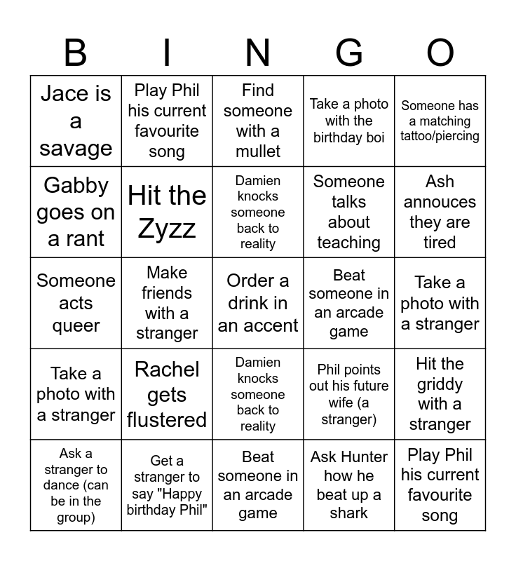 This bingo card has 62 words: Give Phil a hug, Get a stranger to say "Happy birthday Phil", Shot, Take a photo with a stranger, Play Phil his current favourite song, Buy someone you've not met before a drink, Hit the Zyzz, Make friends with a stranger, Someone talks about teaching, Someone acts queer, Take a photo with the birthday boi, Rachel gets flustered, Gabby goes on a rant, Ash annouces they are tired, Phil points out his future wife (a stranger), Jace is a savage, Order a drink in an accent, Someone has a matching tattoo/piercing, Compliment someone, Damien knocks someone back to reality, Beat someone in an arcade game, Find someone with a mullet, Ask a stranger to dance (can be in the group), Ask Hunter how he beat up a shark, Someone shows too much pda, Touch a stranger's moustache, Get a phone number, Ask someone what their tattoos mean, Hit the griddy with a stranger, Give someone a smooch, Someone talks about gym, Give Phil a hug, Get a stranger to say "Happy birthday Phil", Shot, Take a photo with a stranger, Play Phil his current favourite song, Buy someone you've not met before a drink, Hit the Zyzz, Make friends with a stranger, Someone talks about teaching, Someone acts queer, Take a photo with the birthday boi, Rachel gets flustered, Gabby goes on a rant, Ash annouces they are tired, Phil points out his future wife (a stranger), Jace is a savage, Order a drink in an accent, Someone has a matching tattoo/piercing, Compliment someone, Damien knocks someone back to reality, Beat someone in an arcade game, Find someone with a mullet, Ask a stranger to dance (can be in the group), Ask Hunter how he beat up a shark, Someone shows too much pda, Touch a stranger's moustache, Get a phone number, Ask someone what their tattoos mean, Hit the griddy with a stranger, Give someone a smooch and Someone talks about gym.