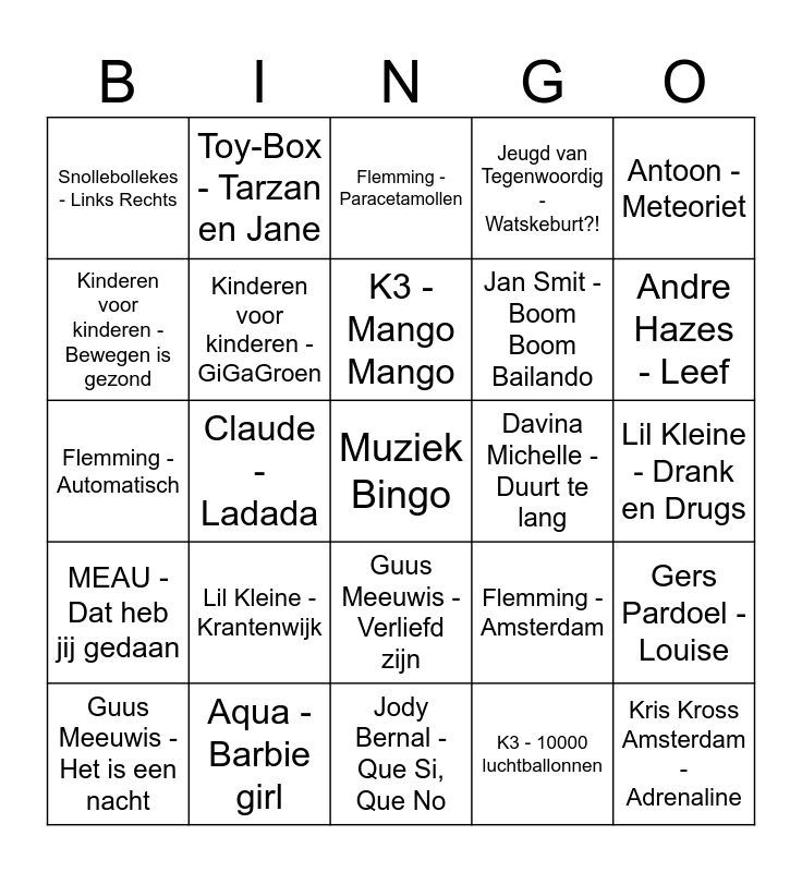 This bingo card has a free space and 71 words: Mart Hoogkamer - Ik ga zwemmen, Toy-Box - Tarzan en Jane, Vengaboys - We're going to Ibiza, Bloem - Even aan mijn moeder vragen, Jody Bernal - Que Si, Que No, Guus Meeuwis - Per Spoor, Jeugd van Tegenwoordig - Watskeburt?!, Nick en Simon - Rosanne, Jan Smit - Boom Boom Bailando, Chipz - 1001 Arabian Nights, Guus Meeuwis - Het is een nacht, Nielson - Beauty & de Brains, Andre Hazes - Leef, Snollebollekes - Links Rechts, Snollebollekes - Vrouwkes, Flemming - Automatisch, Flemming - Amsterdam, Antoon - Meteoriet, Antoon - Hyperventilatie, Lil Kleine - Drank en Drugs, Lil Kleine - Krantenwijk, Kris Kross Amsterdam - Adrenaline, Gers Pardoel - Louise, Gers Pardoel - Ik neem je mee, Gers Pardoel - Bagagedrager, Michael Jackson - Billie Jean, Michael Jackson - Beat it, Snelle en Maan - Biljven slapen, Snelle - Reunie, Suzan en Freek - Goud, Aqua - Barbie girl, Gebroeders Ko - Toeter op m'n waterscooter, Stef Ekkel - Liever te dik in de kist, Jan Smit - Als de morgen is gekomen, K3 - 10000 luchtballonnen, K3 - Mamasé, Cafe the Block - het Vliegerlied, Nielson - Sexy als ik dans, Kinderen voor kinderen - Bewegen is gezond, Guus Meeuwis - Het is een nacht, Guus Meeuwis - Verliefd zijn, Antoon - Hallo, MEAU - Dat heb jij gedaan, Kinderen voor kinderen - Worden wat je wil, Maan - Leven, Flemming - Zij wil mij, Donnie en Rene Froger - Bon gepakt, Kinderen voor kinderen - GiGaGroen, Kinderen voor kinderen - Pasapas, Andre Hazes - Uit mn bol, Frans Bauer - Heb je even voor mij, Nielson - IJskoud, Davina Michelle - Duurt te lang, Gerard Joling - Maak me gek, John de Bever - Jij krijgt die lach niet van mijn gezicht, Wolter Kroes - Ik heb de hele nacht liggen dromen, K3 - Mango Mango, K3 - Waterval, Marco Schuitmaker - Engelbewaarder, Flemming - Verleden tijd, Suzan en Freek - nooit meer regen, Claude - Layla, Claude - Ladada, Snelle - Terugweg, Zoë Tauran - Therapie, Metejoor - Wat wil je van mij, Flemming - Paracetamollen, Snelle - 5 voor 12, Antoon - Klop Klop, BENR - Beetje gek and Flemming - Terug bij Af.
