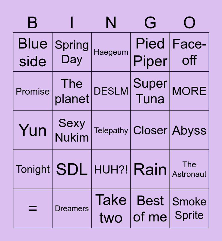 This bingo card has 25 words: SDL, Take two, DESLM, =, Face-off, Blue side, Promise, Spring Day, Closer, HUH?!, Super Tuna, Yun, Rain, The Astronaut, The planet, Smoke Sprite, Abyss, Haegeum, MORE, Sexy Nukim, Telepathy, Dreamers, Tonight, Pied Piper and Best of me.