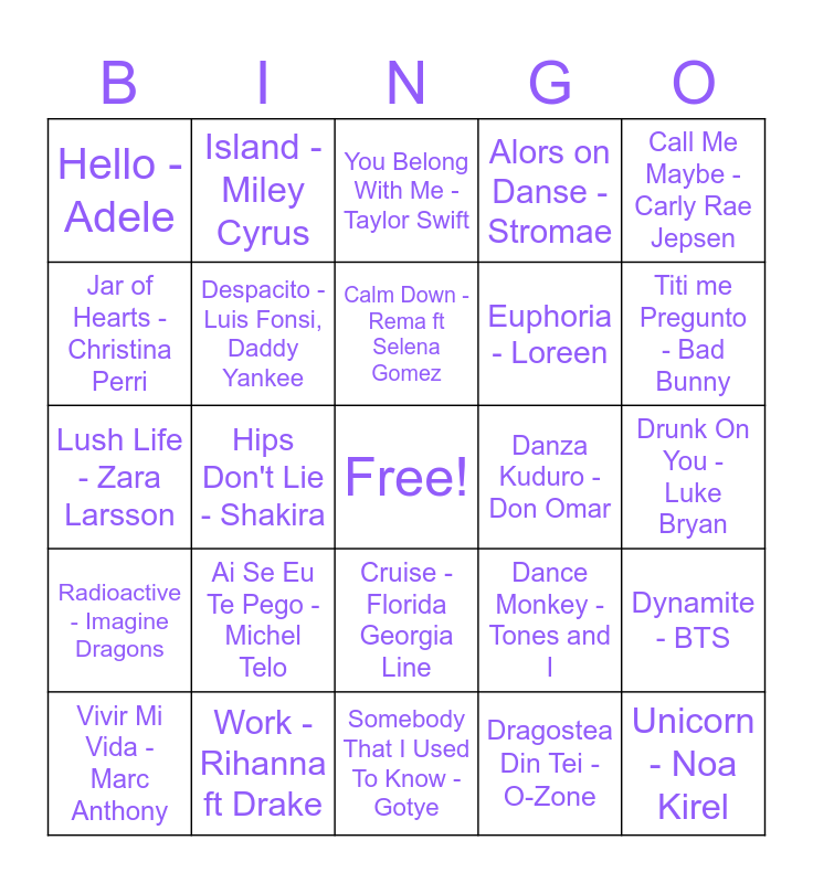 This bingo card has a free space and 24 words: Ai Se Eu Te Pego - Michel Telo, Work - Rihanna ft Drake, Calm Down - Rema ft Selena Gomez, Vivir Mi Vida -Marc Anthony, Call Me Maybe - Carly Rae Jepsen, Hello - Adele, Jar of Hearts - Christina Perri, Island - Miley Cyrus, Danza Kuduro - Don Omar, Cruise - Florida Georgia Line, Euphoria - Loreen, Lush Life - Zara Larsson, Dance Monkey - Tones and I, Dynamite - BTS, Despacito - Luis Fonsi, Daddy Yankee, Dragostea Din Tei - O-Zone, Drunk On You - Luke Bryan, You Belong With Me - Taylor Swift, Titi me Pregunto - Bad Bunny, Hips Don't Lie - Shakira, Unicorn - Noa Kirel, Radioactive - Imagine Dragons, Alors on Danse - Stromae and Somebody That I Used To Know - Gotye.