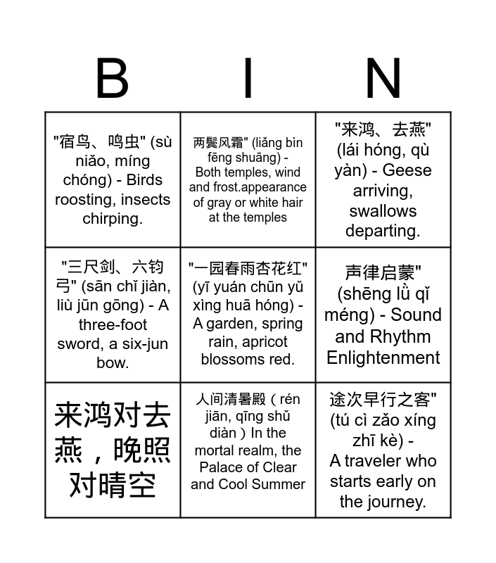 This bingo card has 17 words: 云对雨,雪对风" (yún duì yǔ, xuě duì fēng) - Clouds pair with rain, snow pairs with wind., "晚照,晴空" (wǎn zhào, qíng kōng) - Evening glow, clear sky., "来鸿、去燕" (lái hóng, qù yàn) - Geese arriving, swallows departing., "宿鸟、鸣虫" (sù niǎo, míng chóng) - Birds roosting, insects chirping., Free!, "三尺剑、六钧弓" (sān chǐ jiàn, liù jūn gōng) - A three-foot sword, a six-jun bow., "岭北、江东" (lǐng běi, jiāng dōng) - North of the hills, east of the river., 来鸿对去燕,晚照对晴空, 人间清暑殿(rén jiān, qīng shǔ diàn)In the mortal realm, the Palace of Clear and Cool Summer, 声律启蒙" (shēng lǜ qǐ méng) - Sound and Rhythm Enlightenment, 天上广寒宫 (tiān shàng, guǎng hán gōng)in the heavens, the Palace of the Broad Cold., "两岸晓烟杨柳绿" (liǎng àn xiǎo yān yáng liǔ lǜ) - On both riverbanks, the morning mist, willows green., "一园春雨杏花红" (yī yuán chūn yǔ xìng huā hóng) - A garden, spring rain, apricot blossoms red., 两鬓风霜" (liǎng bìn fēng shuāng) - Both temples, wind and frost.appearance of gray or white hair at the temples, 途次早行之客" (tú cì zǎo xíng zhī kè) - A traveler who starts early on the journey., 一蓑烟雨" (yī suō yān yǔ) - A single raincoat in misty rain. and "溪边晚钓之翁" (xī biān wǎn diào zhī wēng) - An old man fishing by the stream in the evening.