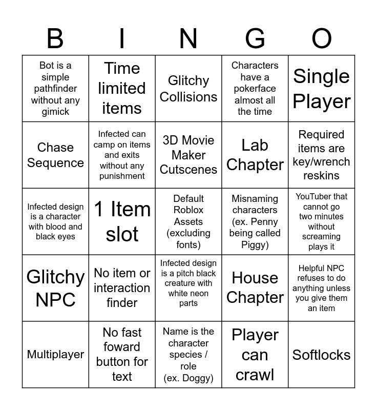 This bingo card has a free space and 29 words: Multiplayer, 10 Minute limit, 1 Item slot, Unskippable cutscenes, Bot is a simple pathfinder without any gimick, Glitchy Collisions, Infected can camp on items and exits without any punishment, No item or interaction finder, Misnaming characters (ex. Penny being called Piggy), No fast foward button for text, YouTuber that cannot go two minutes without screaming plays it, Softlocks, Name is the character species / role (ex. Doggy), Player can crawl, Required items are key/wrench reskins, There's only 1 escape route, Infected design is a pitch black creature with white neon parts, Glitchy NPC, Single Player, Infected design is a character with blood and black eyes, House Chapter, No Replay Mode for cutscenes, Lab Chapter, Chase Sequence, Characters have a pokerface almost all the time, Time limited items, Helpful NPC refuses to do anything unless you give them an item, 3D Movie Maker Cutscenes and Has the same artstyle as CID The Dummy.