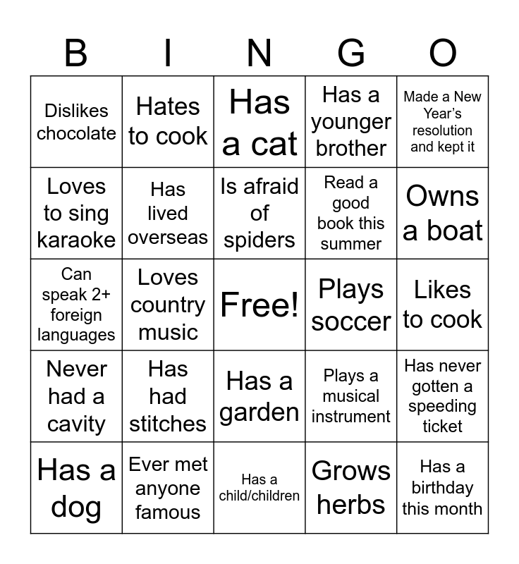 This bingo card has a free space and 62 words: Loves spicy food, Ever met anyone famous, Knows a magic trick, Never had a cavity, Has twins in their family, Is an only child, Has lived overseas, Traveled to more than 10 countries, Read a good book this summer, Was born in the same month as you, Has a younger brother, Likes mushrooms on pizza, Loves to sing karaoke, Actually flosses their teeth everyday, Ran a marathon, Dislikes chocolate, Has a birthday this month, Made a New Year’s resolution and kept it, Has a food allergy, Is afraid of spiders, Plays soccer, Has a cat, Has a dog, Grows herbs, Is left handed, Will not kill a fly, Has slept overnight on a beach, Does not like sports, Has never gotten a speeding ticket, Owns a white car, Prefers Pepsi over Coke, Shopped at Target this week, Shares a name with an ancestor, Doesn’t have Facebook, Likes to cook, Hates to cook, Played in a band, Has a gym membership (that has been used in the last week), Loves country music, Loves to paint, Can speak 2+ foreign languages, Sang a song for an audience, Has had stitches, Is a newlywed, Owns a boat, Plays a musical instrument, Has 3 or more siblings, Has camped this year, Has a collection of something, Has the same hobby as you, Has a garden, Has a child/children, Is the middle child, Is the youngest sibling, Is vegetarian/vegan, Kills house plants, Doesn’t mind a mess, Is a neat freak, Is a night owl, Wears socks to bed, Doesn’t drink coffee and Belongs to a book club.