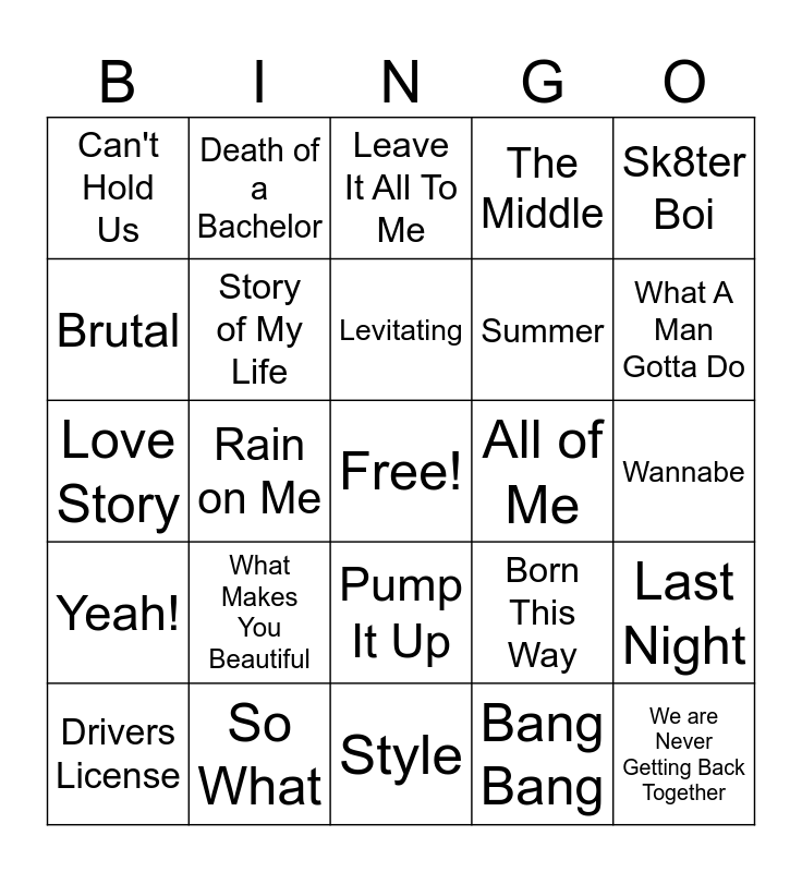 This bingo card has a free space and 49 words: Roar, We are Never Getting Back Together, Let's Go, Style, What Makes You Beautiful, Starships, Death of a Bachelor, Hey Baby, Brutal, Timber, Story of My Life, The Middle, Last Night, Born This Way, Shut Up and Dance, Coming Home, Levitating, All of Me, Dirty Little Secret, Sk8ter Boi, Rain on Me, Bang Bang, Can't Hold Us, Summer, Made You Look, What A Man Gotta Do, Drivers License, Where Them Girls At, Pump It Up, Yeah!, 7 Things, Bless the Broken Road, California Girls, Umbrella, So What, Chocolate, Hebrew Alphabet, C is For Cookie, Wannabe, Everyday, Cruisin for a Brusin, 5 Fingaz to the Face, Replay, Cruel Summer, Love Story, Leave It All To Me, Haven't Met You Yet, We Rock and You're Welcome.