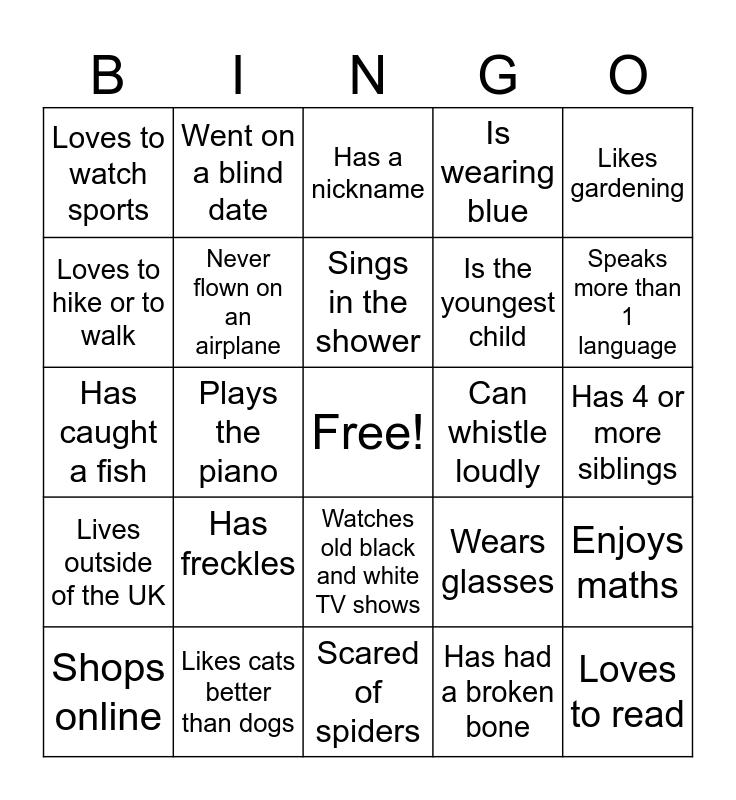 This bingo card has a free space and 24 words: Has freckles, Likes cats better than dogs, Sings in the shower, Shops online, Likes gardening, Loves to watch sports, Loves to hike or to walk, Went on a blind date, Can whistle loudly, Watches old black and white TV shows, Is the youngest child, Has caught a fish, Wears glasses, Enjoys maths, Never flown on an airplane, Has had a broken bone, Has 4 or more siblings, Has a nickname, Speaks more than 1 language, Plays the piano, Loves to read, Lives outside of the UK, Is wearing blue and Scared of spiders.