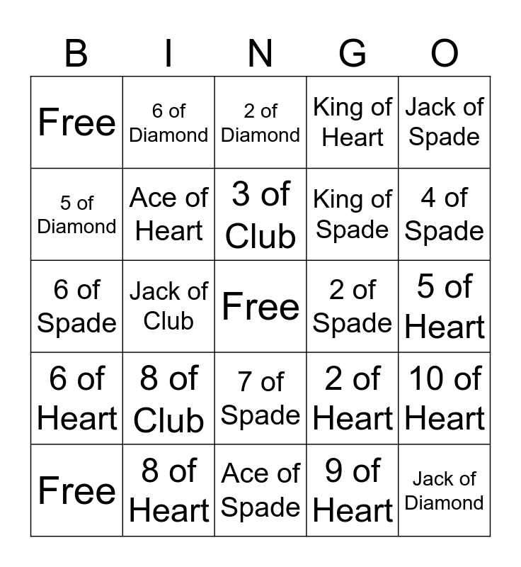 This bingo card has a free space and 56 words: Free, Free, Free, Free, Ace of Spade, Ace of Club, Ace of Heart, Ace of Diamond, King of Spade, King of Club, King of Heart, King of Diamond, Queen of Spade, Queen of Club, Queen of Heart, Queen of Diamond, Jack of Spade, Jack of Club, Jack of Heart, Jack of Diamond, 2 of Spade, 2 of Club, 2 of Heart, 2 of Diamond, 3 of Spade, 3 of Club, 3 of Heart, 3 of Diamond, 4 of Spade, 4 of Club, 4 of Heart, 4 of Diamond, 5 of Spade, 5 of Club, 5 of Heart, 5 of Diamond, 6 of Spade, 6 of Club, 6 of Heart, 6 of Diamond, 7 of Spade, 7 of Club, 7 of Heart, 7 of Diamond, 8 of Spade, 8 of Club, 8 of Heart, 8 of Diamond, 9 of Spade, 9 of Club, 9 of Heart, 9 of Diamond, 10 of Spade, 10 of Club, 10 of Heart and 10 of Diamond.