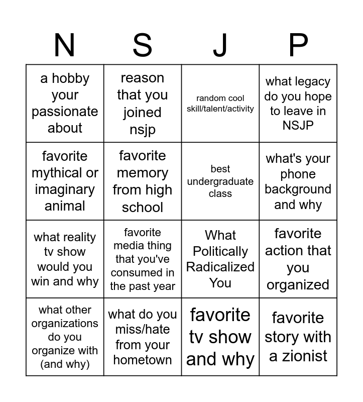 This bingo card has 19 words: What Politically Radicalized You, First organizing experience, random cool skill/talent/activity, favorite story with a zionist, favorite action that you organized, favorite mythical or imaginary animal, favorite tv show and why, a hobby your passionate about, reason that you joined nsjp, what reality tv show would you win and why, favorite media thing that you've consumed in the past year, favorite memory from high school, best undergraduate class, what do you miss/hate from your hometown, what other organizations do you organize with (and why), childhood dream job, what legacy do you hope to leave in NSJP, what's your phone background and why and favorite video game and why.