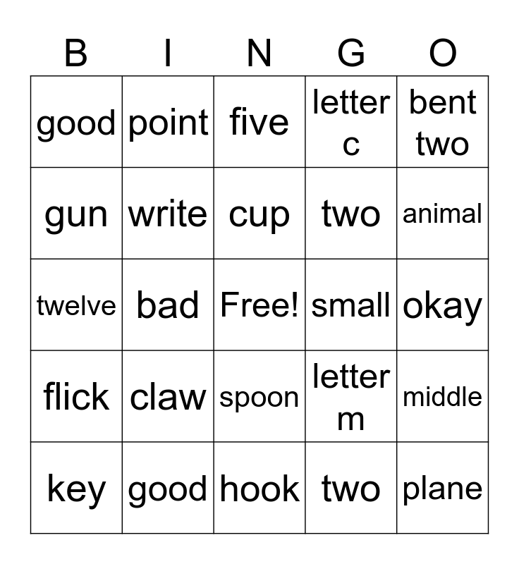 This bingo card has a free space and 25 words: claw, hook, cup, key, bent two, good, gun, point, small, spoon, two, twelve, letter m, middle, write, flat, okay, five, animal, bad, plane, good, flick, letter c and two.