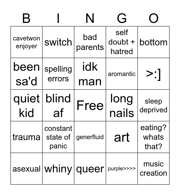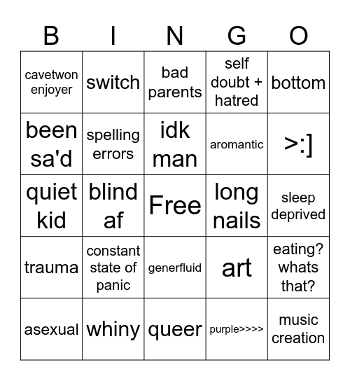 This bingo card has a free space and 24 words: constant state of panic, whiny, idk man, asexual, bottom, cavetwon enjoyer, been sa'd, switch, long nails, generfluid, aromantic, quiet kid, art, eating? whats that?, spelling errors, purple>>>>, sleep deprived, bad parents, >:], blind af, music creation, trauma, self doubt + hatred and queer.