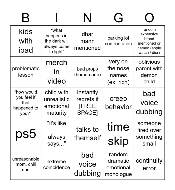 This bingo card has a free space and 36 words: voiceover, kid with ipad, "you see" / "so you see", merch in video, time skip, ps5, bad props (homemade), flashback, random expensive brand mentioned or named (apple watch / dior), sexism, child with unrealistic emotional maturity, parking lot confrontation, spaghetti, creep behavior, oblivious parent with demon child, kids with ipad, cartoon supervillain, "it's like ____ always says...", continuity error, dhar mann mentioned, bad voice dubbing, someone fired over something small, extreme coincidence, unreasonable mom, chill dad, bad voice dubbing, “what happens in the dark will always come to light”, “how would you feel if that happened to you?”, conversation in car, very on the nose names (ex; rich), problematic lesson, bad green screen, clearly in wrong person has attitude, random dramatic emotional monologue, talks to themself, extremely conspicuous disguise and single parent.