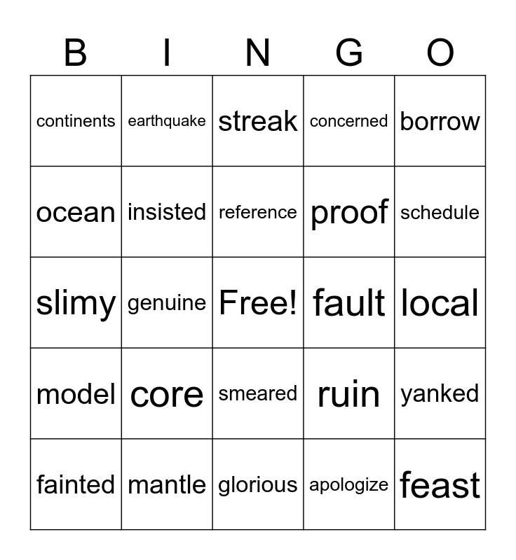 This bingo card has a free space and 24 words: core, mantle, reference, fainted, borrow, continents, ocean, earthquake, fault, smeared, proof, slimy, ruin, yanked, insisted, apologize, local, streak, schedule, genuine, feast, model, concerned and glorious.