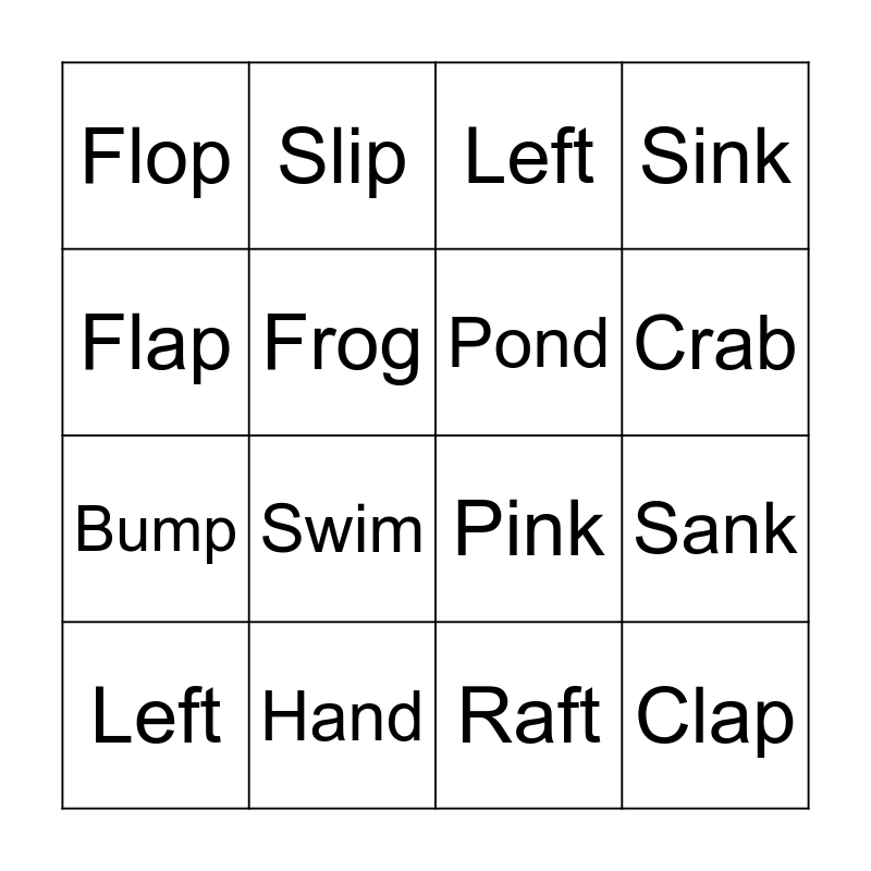 This bingo card has 23 words: Clap, Club, Crab, Drop, Flap, Flop, Frog, Slip, Left, Step, Swim, Bump, Bank, Gift, Hand, Jump, Left, Pink, Pond, Sank, Sink, Raft and Lift.