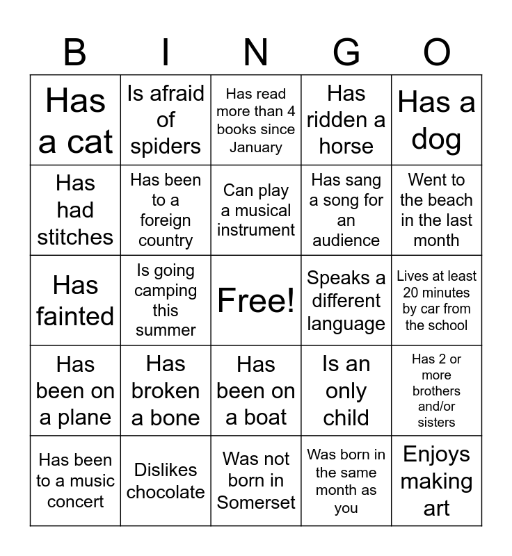 This bingo card has a free space and 24 words: Has broken a bone, Dislikes chocolate, Can play a musical instrument, Has been to a music concert, Has a dog, Has a cat, Has had stitches, Is afraid of spiders, Speaks a different language, Has been on a boat, Has sang a song for an audience, Has fainted, Is an only child, Has 2 or more brothers and/or sisters, Has been to a foreign country, Was born in the same month as you, Lives at least 20 minutes by car from the school, Has read more than 4 books since January, Went to the beach in the last month, Is going camping this summer, Enjoys making art, Has been on a plane, Has ridden a horse and Was not born in Somerset.