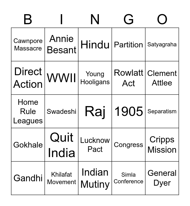This bingo card has 56 words: Nehru, Gandhi, Jinnah, Cawnpore Massacre, Indian Mutiny, WWI, WWII, Amritsar Massacre, Rowlatt Act, Simon Commission, Partition, 1st RTC, 2nd RTC, 3rd RTC, Princely States, Government of India Act, Satyagraha, Swadeshi, Ahimsa, Raj, 1905, Muslim League, Congress, Hindu, Partition of Bengal, Young Hooligans, Subhas Chandra Bose, Winston Churchill, Clement Attlee, Purna Swaraj, Lahore Resolution, Indian National Army, Gandhi-Irwin Pact, Nehru Report, Separatism, Direct Action, Home Rule Leagues, Tilak, Gokhale, Annie Besant, Lucknow Pact, General Dyer, Michael O'Dwyer, Non-Cooperation Movement, Salt March, Quit India, Khilafat Movement, Caste system, Fast-unto-death, Communal Awards, Simla Conference, Lord Irwin, Lord Mountbatten, Charka, Cripps Mission and Boundary Commission.