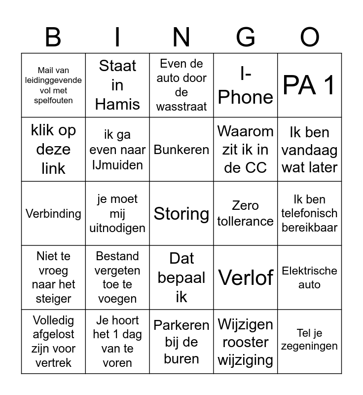This bingo card has 25 words: Bestand vergeten toe te voegen, Parkeren bij de buren, Bunkeren, Volledig afgelost zijn voor vertrek, PA 1, Mail van leidinggevende vol met spelfouten, klik op deze link, Staat in Hamis, Zero tollerance, Dat bepaal ik, Waarom zit ik in de CC, Verbinding, Verlof, Elektrische auto, ik ga even naar IJmuiden, Tel je zegeningen, Ik ben telefonisch bereikbaar, Even de auto door de wasstraat, Ik ben vandaag wat later, je moet mij uitnodigen, Storing, Je hoort het 1 dag van te voren, Niet te vroeg naar het steiger, I-Phone and Wijzigen rooster wijziging.