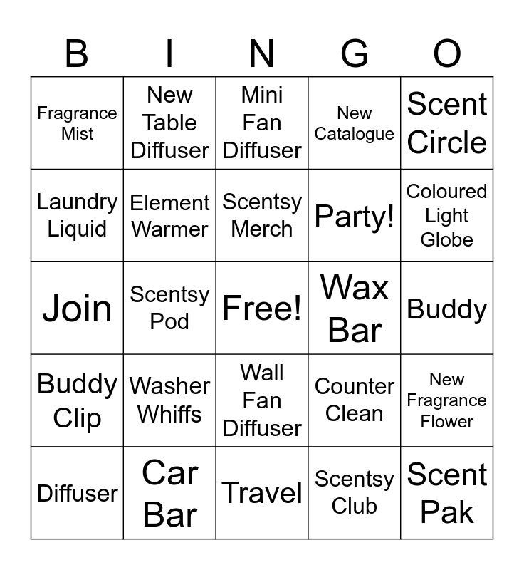 This bingo card has a free space and 29 words: Diffuser, Wall plug warmer, Scentsy Pod, Aqua glow warmer, Fragrance Mist, Mini Fan Diffuser, Element Warmer, Washer Whiffs, Wax Bar, Car Bar, Buddy, Scent Pak, Travel, Scentsy Club, Coloured Light Globe, Fragrance Flower, Wall Fan Diffuser, Buddy Clip, Scent Circle, Join, Counter Clean, AZIZA Warmer, Party!, Laundry Liquid, New Catalogue, New Table Diffuser, New Fragrance Flower, Scentsy Merch and Whiff Box.
