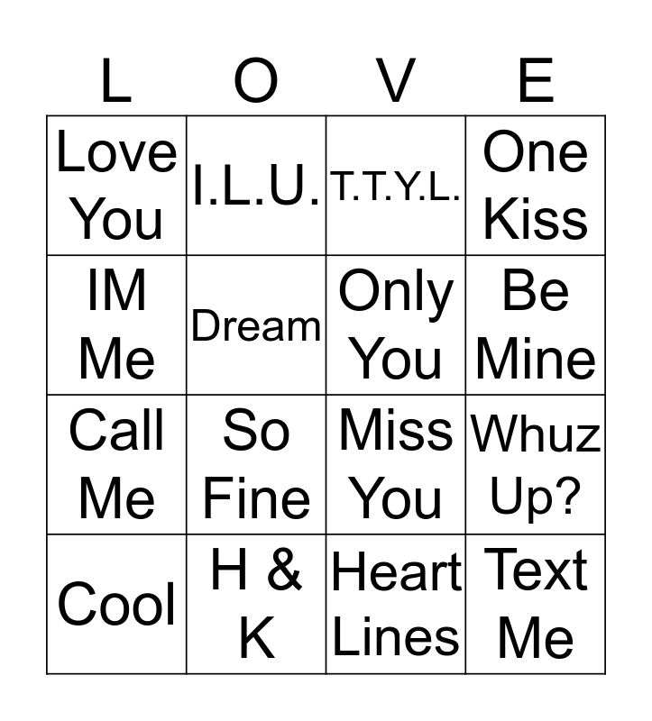 This bingo card has a free space and 15 words: Cool, Text Me, T.T.Y.L., Love You, Be Mine, IM Me, So Fine, Heart Lines, Dream, Call Me, Whuz Up?, One Kiss, Only You, I.L.U. and H & K.