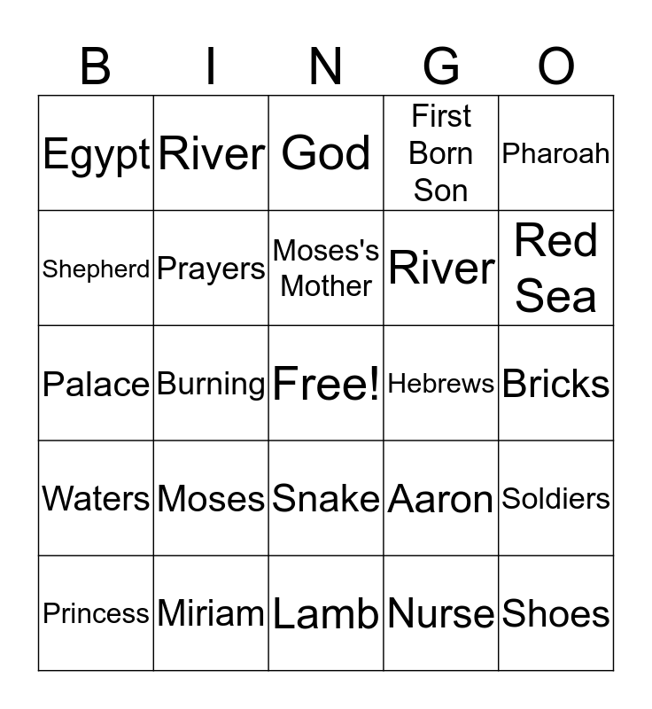 This bingo card has a free space and 24 words: Moses, Miriam, Moses's Mother, Princess, Pharoah, Egypt, Shepherd, River, Hebrews, Snake, River, Palace, Aaron, Soldiers, Prayers, Nurse, Bricks, God, Red Sea, Burning, Shoes, Waters, First Born Son and Lamb.