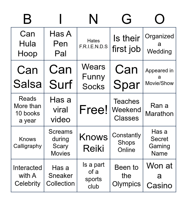 This bingo card has a free space and 25 words: Screams during Scary Movies, Is a part of a sports club, Wears Funny Socks, Interacted with A Celebrity, Organized a Wedding, Can Hula Hoop, Can Salsa, Has A Pen Pal, Teaches Weekend Classes, Knows Reiki, Can Spar, Reads More than 10 books a year, Constantly Shops Online, Has a Secret Gaming Name, Can Surf, Carpools, Ran a Marathon, Hates F.R.I.E.N.D.S, Appeared in a Movie/Show, Has a viral video, Won at a Casino, Has a Sneaker Collection, Knows Calligraphy, Is their first job and Been to the Olympics.