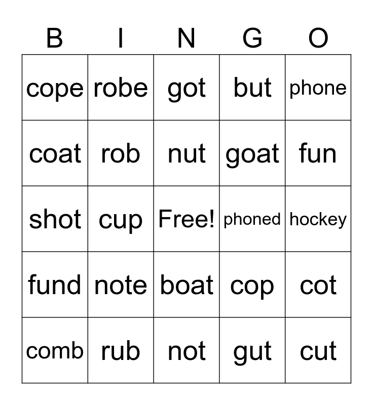 This bingo card has a free space and 25 words: note, not, nut, comb, phone, cope, coat, robe, phoned, boat, goat, shot, cop, cot, rob, fond, hockey, got, fun, cup, cut, rub, fund, but and gut.