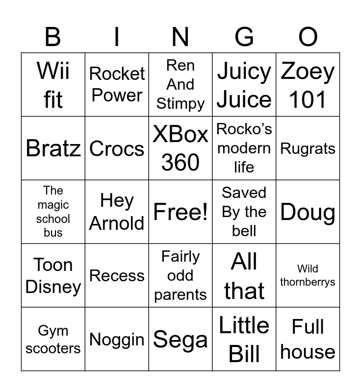 This bingo card has a free space and 24 words: Recess, Noggin, XBox 360, Gym scooters, Zoey 101, Wii fit, Bratz, Rocket Power, Saved By the bell, Fairly odd parents, Rocko’s modern life, The magic school bus, All that, Wild thornberrys, Crocs, Little Bill, Doug, Ren And Stimpy, Rugrats, Hey Arnold, Full house, Toon Disney, Juicy Juice and Sega.