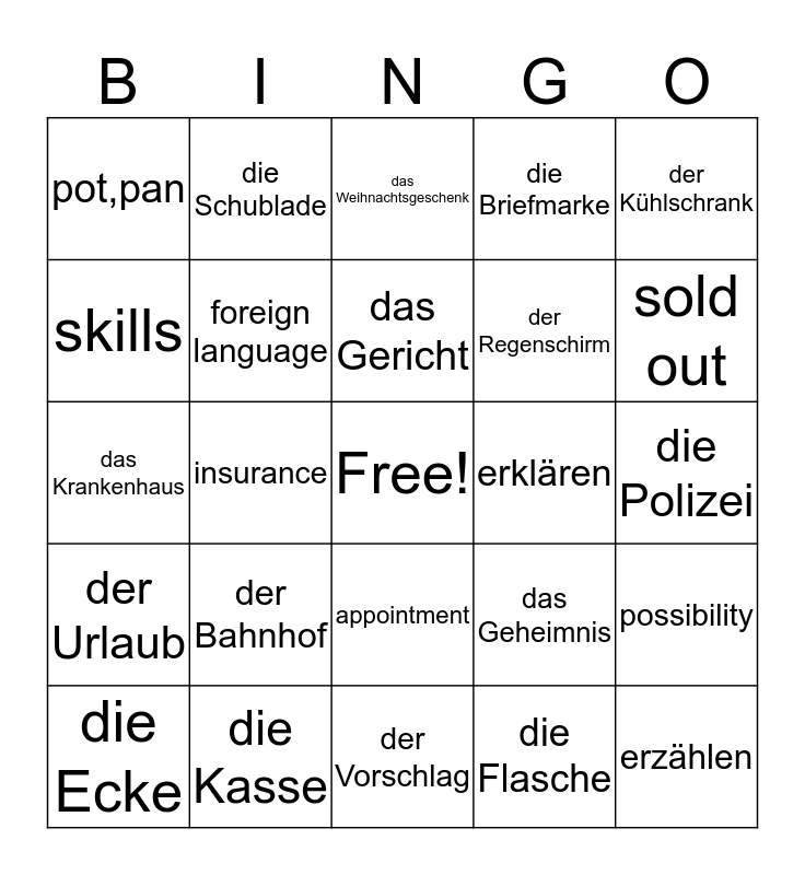 This bingo card has a free space and 24 words: der Bahnhof, die Kasse, das Gericht, die Ecke, der Kühlschrank, pot,pan, skills, die Schublade, erklären, appointment, der Regenschirm, das Krankenhaus, das Geheimnis, possibility, foreign language, die Flasche, die Polizei, das Weihnachtsgeschenk, sold out, insurance, erzählen, der Urlaub, die Briefmarke and der Vorschlag.