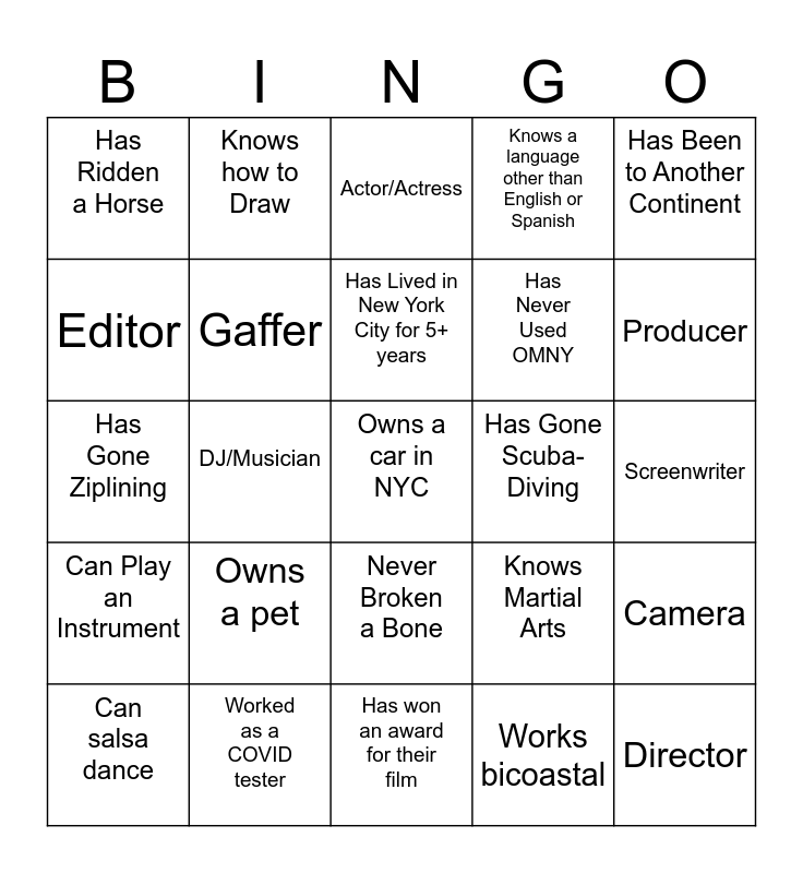 This bingo card has 25 words: Owns a pet, Has won an award for their film, Has Lived in New York City for 5+ years, Can salsa dance, Has Been to Another Continent, Has Ridden a Horse, Editor, Knows how to Draw, Has Gone Scuba-Diving, Never Broken a Bone, Has Never Used OMNY, Has Gone Ziplining, Knows Martial Arts, Camera, Gaffer, Director, Screenwriter, Actor/Actress, Producer, DJ/Musician, Owns a car in NYC, Worked as a COVID tester, Can Play an Instrument, Knows a language other than English or Spanish and Works bicoastal.