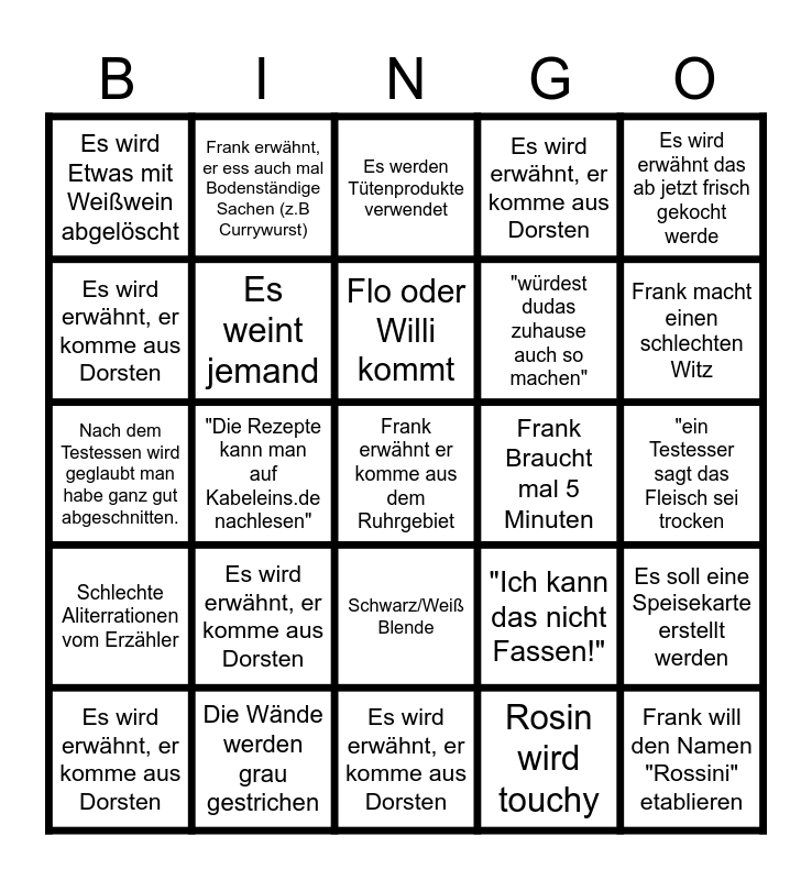 This bingo card has 30 words: Es wird erwähnt, er komme aus Dorsten, Seine Sterne werden erwähnt, Flo oder Willi kommt, er lästert im beisein der "Kunden" über selbige, Es wird erwähnt das ab jetzt frisch gekocht werde, Es wird Etwas mit Weißwein abgelöscht, Frank erwähnt, er ess auch mal Bodenständige Sachen (z.B Currywurst), Schwarz/Weiß Blende, Frank Braucht mal 5 Minuten, Frank will den Namen "Rossini" etablieren, Schlechte Aliterrationen vom Erzähler, Es weint jemand, Rosins Restaurats Bingo, Rosin wird touchy, Es soll eine Speisekarte erstellt werden, Die Inhaber sind verschuldet, "Die Rezepte kann man auf Kabeleins.de nachlesen", Frank erwähnt er komme aus dem Ruhrgebiet, "Ich kann das nicht Fassen!", Frank macht einen schlechten Witz, Nach dem Testessen wird geglaubt man habe ganz gut abgeschnitten., Die Wände werden grau gestrichen, Es werden Tütenprodukte verwendet, "würdest dudas zuhause auch so machen", "ein Testesser sagt das Fleisch sei trocken, Es wird erwähnt, er komme aus Dorsten, Es wird erwähnt, er komme aus Dorsten, Es wird erwähnt, er komme aus Dorsten, Es wird erwähnt, er komme aus Dorsten and Es wird erwähnt, er komme aus Dorsten.