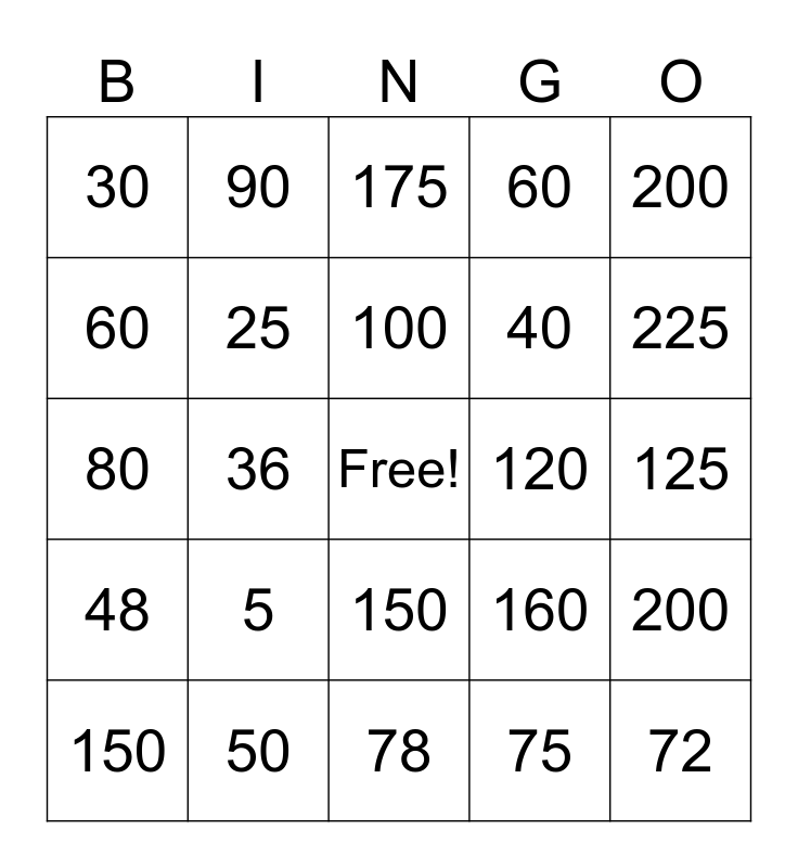 This bingo card has a free space and 24 words: 5, 50, 100, 150, 200, 30, 60, 90, 120, 150, 40, 80, 160, 200, 25, 75, 125, 175, 225, 36, 72, 48, 60 and 78.
