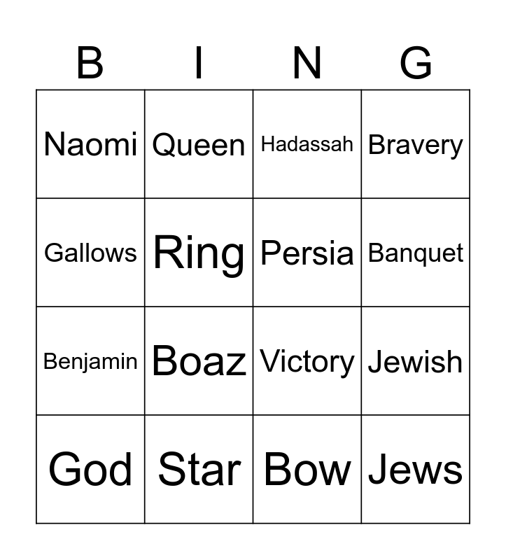 This bingo card has 38 words: Esther, Mordecai, Haman, Persia, Xerxes, Purim, Banquet, Free!, Gallows, Benjamin, Jewish, Bravery, God, Bow, Ring, Jews, Judah, Hadassah, Nobles, Star, Naomi, Moab, Boaz, Field, Daughter, Harvest, Bread, Barley, Elimelech, Israel, Wife, Obed, Crown, Queen, Robes, Faith, Victory and Hope.