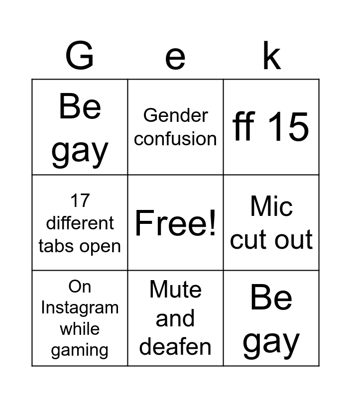 This bingo card has a free space and 8 words: Mic cut out, ff 15, Gender confusion, On Instagram while gaming, Be gay, Be gay, 17 different tabs open and Mute and deafen.