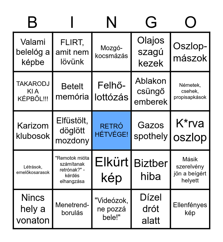 This bingo card has a free space and 24 words: "Remotok mióta számítanak retrónak?" - kérdés elhangzása, Menetrend-borulás, Felhő-lottózás, Nincs hely a vonaton, Oszlop-mászok, Valami belelóg a képbe, TAKARODJ KI A KÉPBŐL!!!, FLIRT, amit nem lövünk, Gazos spothely, Elkürt kép, Ablakon csüngő emberek, Karizom klubosok, Biztber hiba, Másik szerelvény jön a beígért helyett, Betelt memória, Dízel drót alatt, K*rva oszlop, Mozgó-kocsmázás, Németek, csehek, propisapkások, Elfüstölt, döglött mozdony, Ellenfényes kép, Létrások, emelőkosarasok, Olajos szagú kezek and "Videózok, ne pozzá bele!".