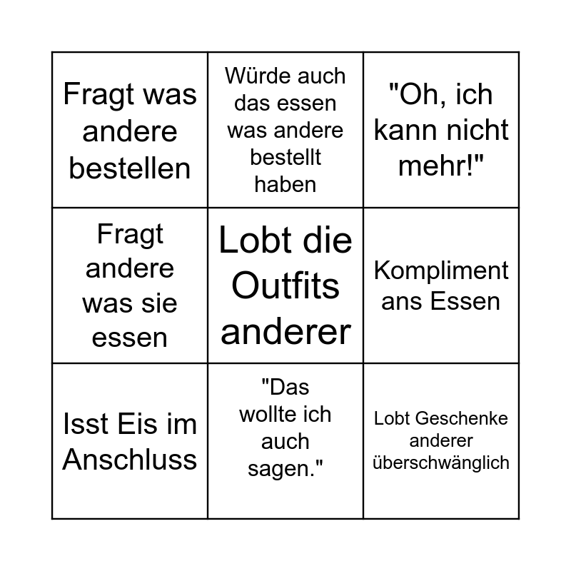 This bingo card has a free space and 8 words: Fragt andere was sie essen, Würde auch das essen was andere bestellt haben, Kompliment ans Essen, Isst Eis im Anschluss, "Oh, ich kann nicht mehr!", Fragt was andere bestellen, "Das wollte ich auch sagen." and Lobt Geschenke anderer überschwänglich.