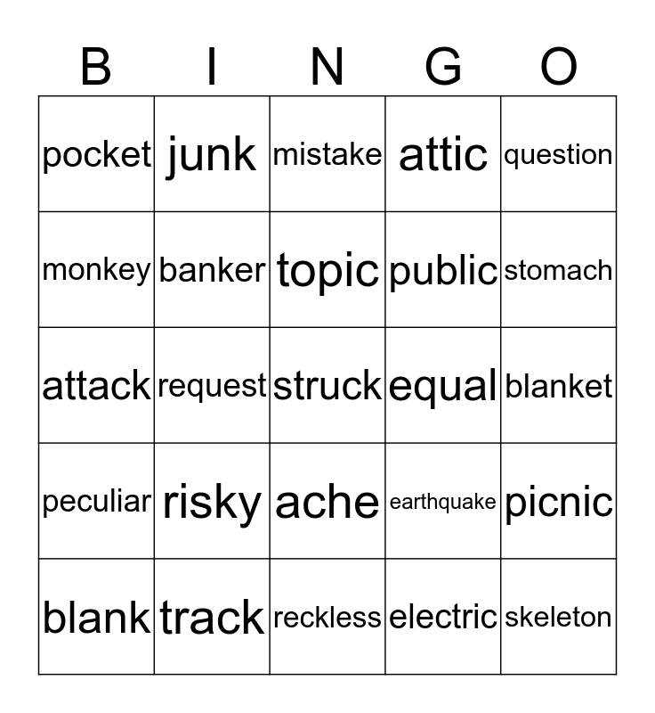 This bingo card has a free space and 24 words: risky, track, topic, blank, question, pocket, monkey, junk, equal, ache, public, attack, earthquake, picnic, banker, electric, blanket, mistake, stomach, request, skeleton, peculiar, attic and reckless.
