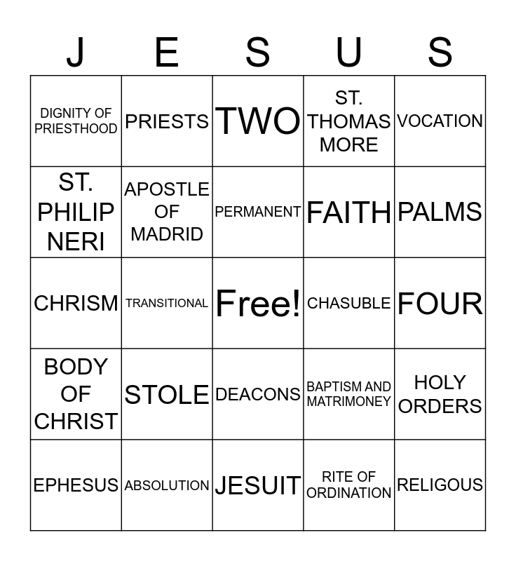 This bingo card has a free space and 24 words: STOLE, ABSOLUTION, PERMANENT, EPHESUS, VOCATION, DIGNITY OF PRIESTHOOD, ST. PHILIP NERI, PRIESTS, CHASUBLE, DEACONS, FAITH, CHRISM, BAPTISM AND MATRIMONEY, HOLY ORDERS, APOSTLE OF MADRID, RITE OF ORDINATION, FOUR, TWO, PALMS, TRANSITIONAL, RELIGOUS, BODY OF CHRIST, ST. THOMAS MORE and JESUIT.