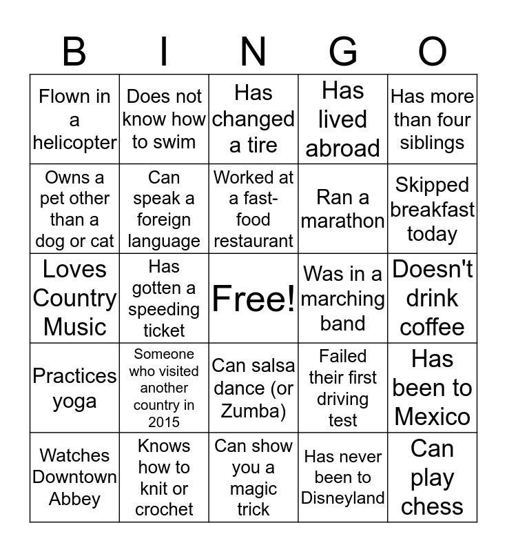 This bingo card has a free space and 24 words: Someone who visited another country in 2015, Knows how to knit or crochet, Worked at a fast-food restaurant, Watches Downtown Abbey, Has more than four siblings, Flown in a helicopter, Owns a pet other than a dog or cat, Does not know how to swim, Was in a marching band, Can salsa dance (or Zumba), Ran a marathon, Loves Country Music, Failed their first driving test, Has been to Mexico, Can speak a foreign language, Has never been to Disneyland, Doesn't drink coffee, Has changed a tire, Skipped breakfast today, Has gotten a speeding ticket, Can play chess, Practices yoga, Has lived abroad and Can show you a magic trick.