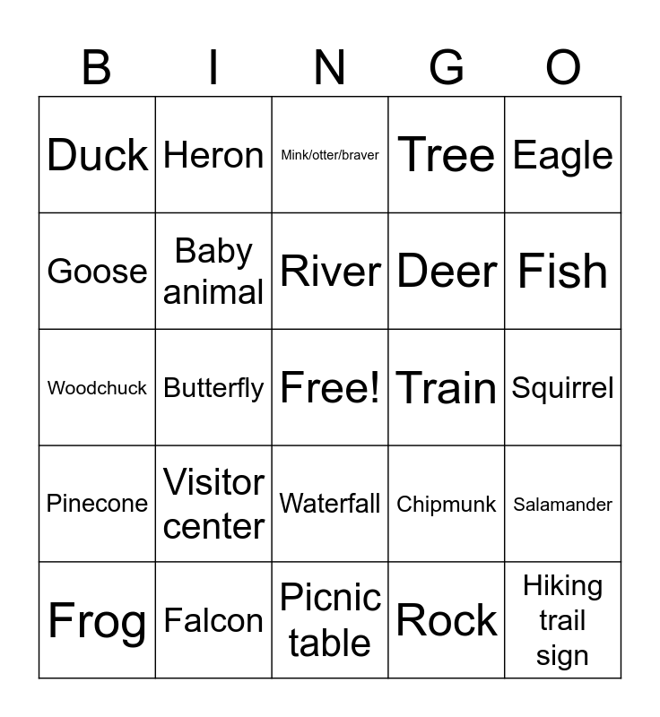 This bingo card has a free space and 26 words: Waterfall, Rock, River, Falcon, Eagle, Duck, Goose, Heron, Squirrel, Chipmunk, Deer, Woodchuck, Salamander, Frog, Butterfly, Nest, Tree, Pinecone, Mink/otter/braver, Hiking trail sign, Fish, Picnic table, Train, Visitor center, Baby animal and Song bird.