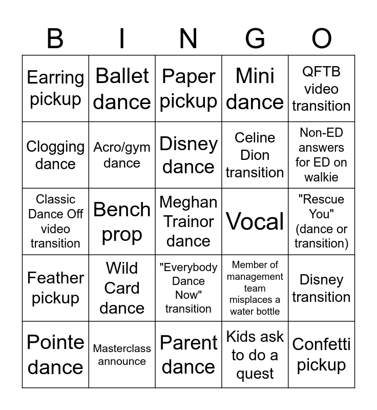 This bingo card has 29 words: Pointe dance, Big prop, Bench prop, Confetti pickup, Earring pickup, Paper pickup, Acro/gym dance, Wild Card dance, Vocal, Masterclass announce, "Rescue You" (dance or transition), Meghan Trainor dance, Parent dance, Kids ask to do a quest, Non-ED answers for ED on walkie, Greatest Showman dance, "Everybody Dance Now" transition, Feather pickup, QFTB video transition, Classic Dance Off video transition, Member of management team misplaces a water bottle, Member of management team misplaces their phone, Celine Dion transition, Clogging dance, Mini dance, Ballet dance, Disney transition, Disney dance and Michael Jackson dance.