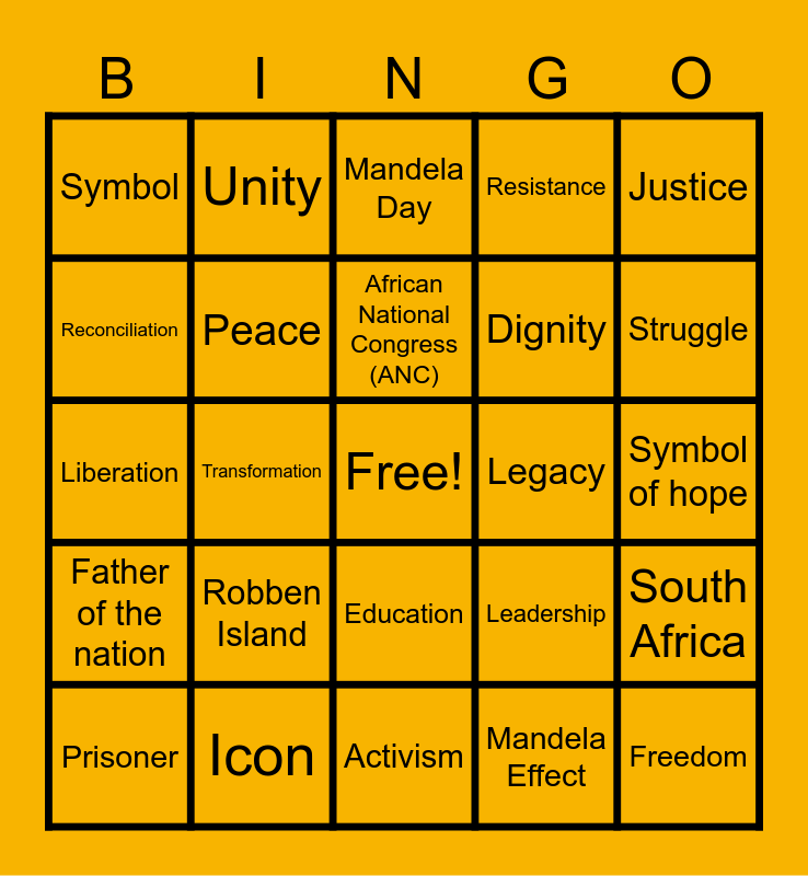 This bingo card has a free space and 50 words: Anti-apartheid, Freedom, Democracy, Activism, Robben Island, President, Unity, Equality, Reconciliation, Human rights, Peace, Resistance, South Africa, Leadership, Inspirational, Imprisonment, African National Congress (ANC), Legacy, Nobel Peace Prize, Justice, Transformation, Mandela Effect, Symbol, Dignity, Forgiveness, Truth and Reconciliation Commission, Struggle, Courage, Mandela Day, Education, Activist, Exile, Social justice, Mentor, Icon, Rivonia Trial, Racial equality, Peaceful resistance, Ubuntu, Symbol of hope, Inspirational speeches, Advocate, Negotiation, Freedom fighter, Prisoner, Liberation, Nonviolence, Bridge builder, Father of the nation and Inspirational leader.