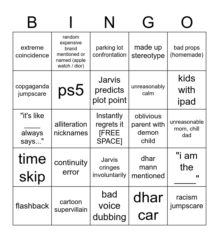 This bingo card has a free space and 34 words: dhar mann voiceover, dhar car, "you see" / "so you see", merch in video, time skip, ps5, bad props (homemade), flashback, random expensive brand mentioned or named (apple watch / dior), dhar mann studios office in the video, Jarvis predicts plot point, parking lot confrontation, spaghetti, creep behavior, oblivious parent with demon child, kids with ipad, cartoon supervillain, "it's like ____ always says...", continuity error, dhar mann mentioned, Jarvis cringes involuntarily, someone fired over something small, extreme coincidence, unreasonable mom, chill dad, bad voice dubbing, racism jumpscare, made up stereotype, rando dhar appearance, unreasonably calm, copgaganda jumpscare, chekhov's _____, alliteration nicknames, "i am the ____" and actually good episode.