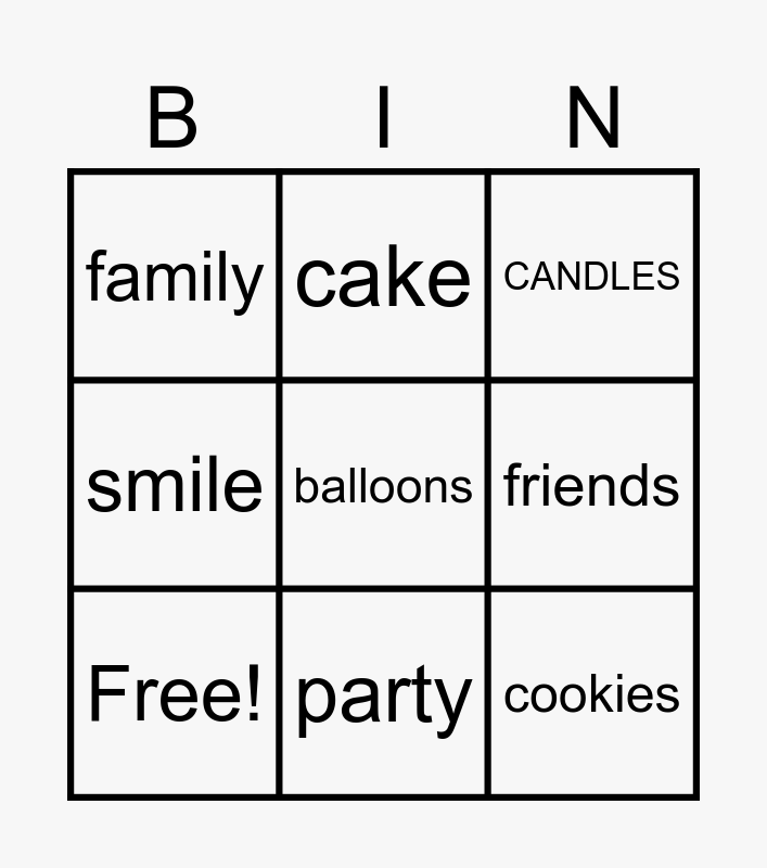 This bingo card has 9 words: Free!, CANDLES, cake, smile, family, friends, balloons, cookies and party.