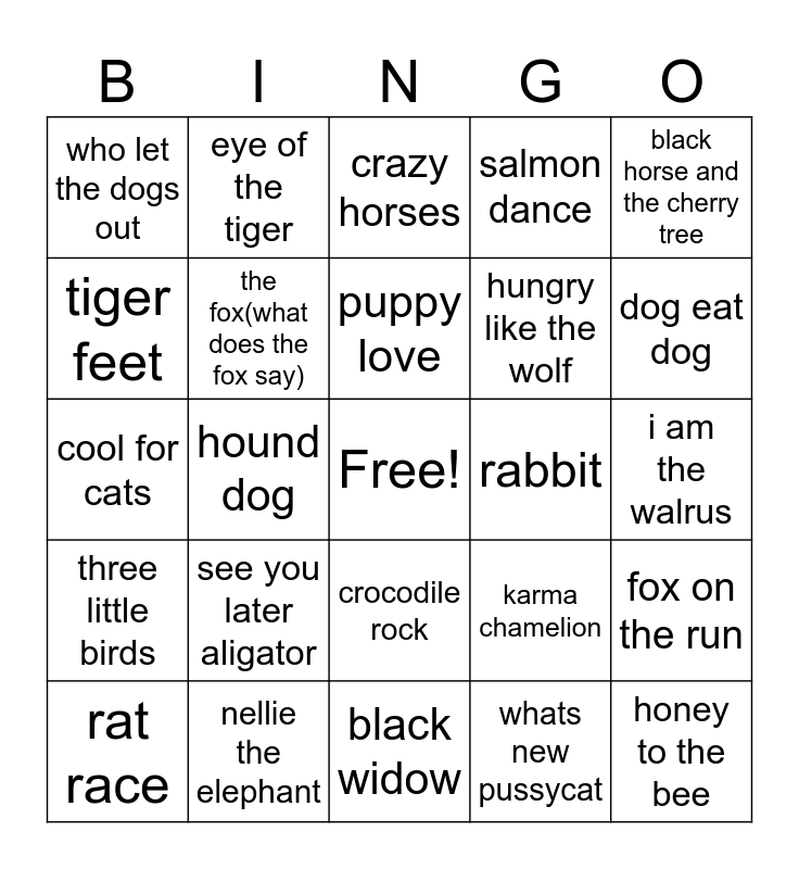 This bingo card has a free space and 24 words: see you later aligator, nellie the elephant, puppy love, rat race, black horse and the cherry tree, who let the dogs out, tiger feet, eye of the tiger, rabbit, crocodile rock, hungry like the wolf, cool for cats, karma chamelion, fox on the run, the fox(what does the fox say), whats new pussycat, i am the walrus, crazy horses, dog eat dog, hound dog, honey to the bee, three little birds, salmon dance and black widow.