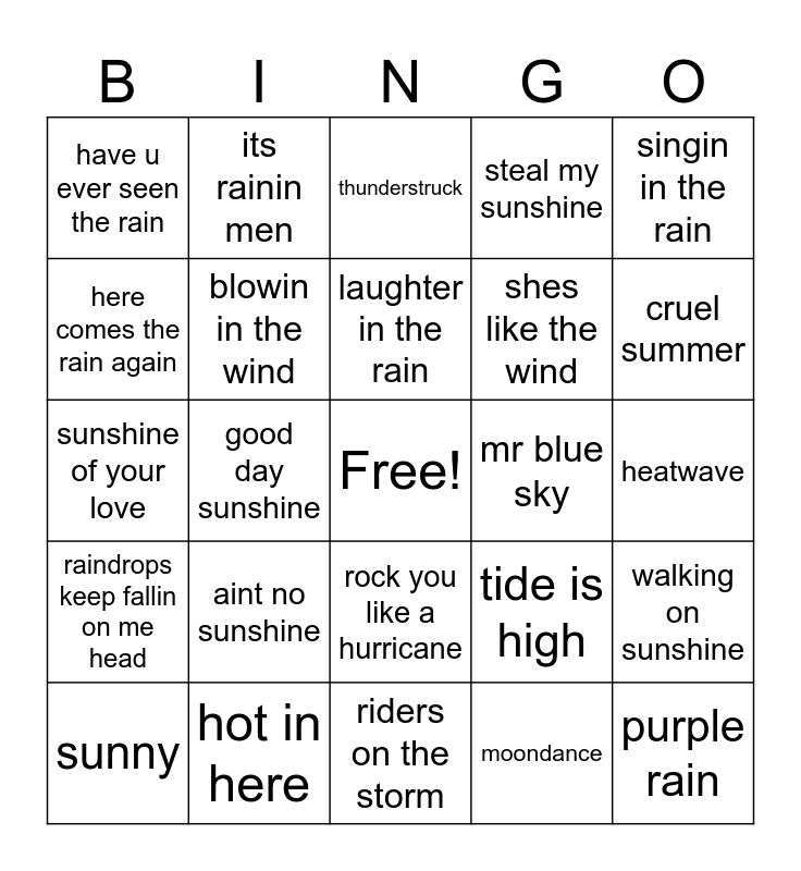 This bingo card has a free space and 24 words: aint no sunshine, hot in here, laughter in the rain, sunny, singin in the rain, have u ever seen the rain, here comes the rain again, its rainin men, mr blue sky, rock you like a hurricane, shes like the wind, sunshine of your love, tide is high, walking on sunshine, blowin in the wind, moondance, heatwave, thunderstruck, cruel summer, good day sunshine, purple rain, raindrops keep fallin on me head, steal my sunshine and riders on the storm.