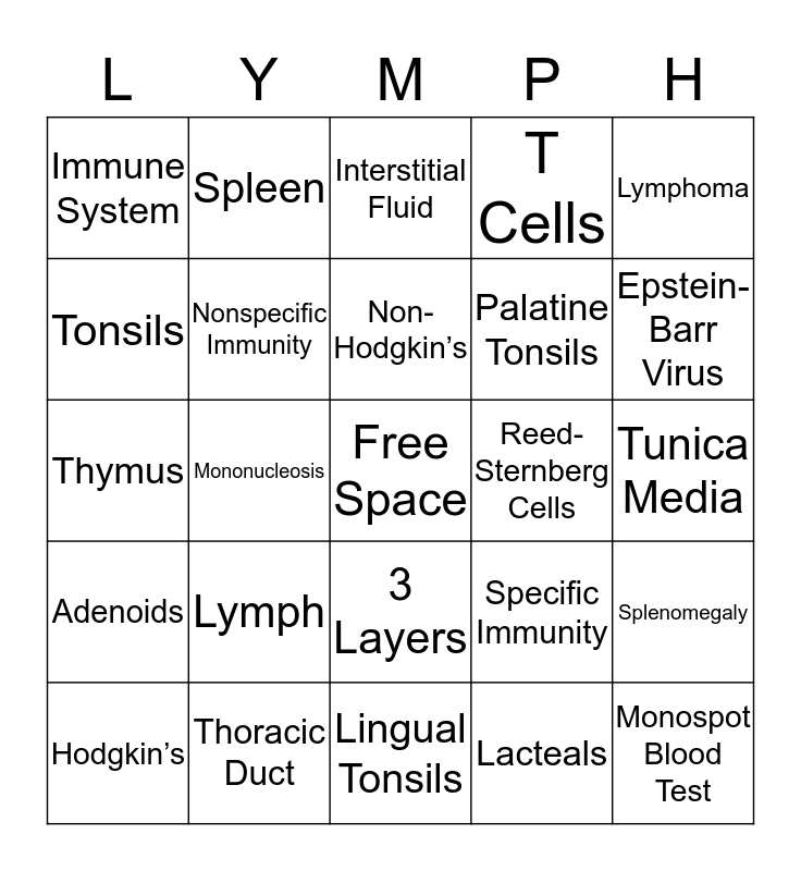 This bingo card has a free space and 24 words: Lymph, Thoracic Duct, Non- Hodgkin’s, Hodgkin’s, Lymphoma, Immune System, Tonsils, Spleen, Reed-Sternberg Cells, 3 Layers, Palatine Tonsils, Thymus, Specific Immunity, Splenomegaly, Nonspecific Immunity, Lacteals, Tunica Media, Interstitial Fluid, Epstein-Barr Virus, Mononucleosis, Monospot Blood Test, Adenoids, T Cells and Lingual Tonsils.